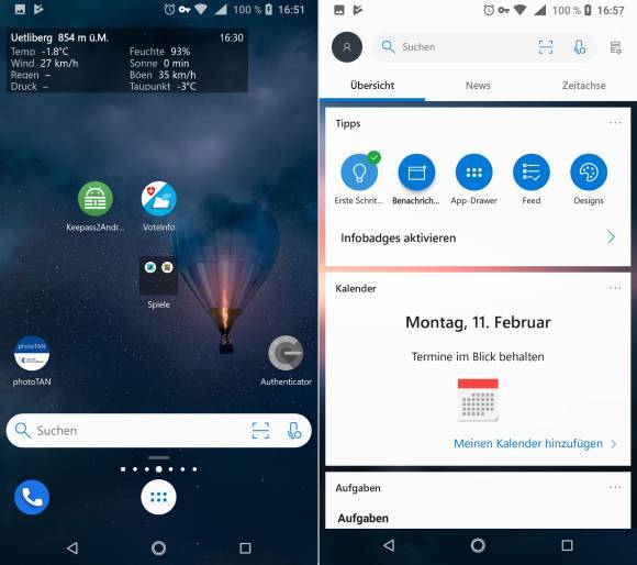 Wischen Sie zum ganz linken Bildschirm, landen Sie in einer Art Infozentrale mit Microsoft-Apps. Hier ist auch (noch als Beta-Funktion) die Zeitachse zu finden, die in Windows 10 Einzug gehalten hat. Verknüpfen Sie dieses Android-Handy mit Ihrem Windows-10-PC, können Sie demnächst nahtlos an den Dokumenten weiterarbeiten, die Sie auf Ihrem Computer zuletzt geöffnet hatten.