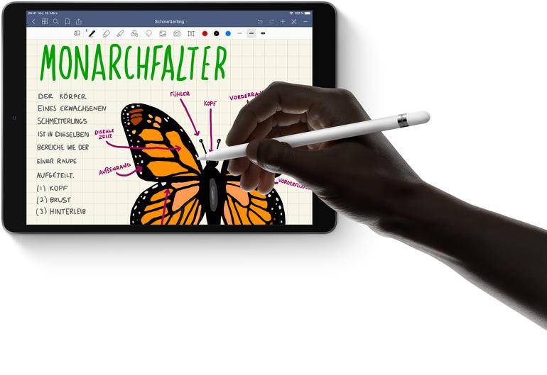Auch wenn es „nur“ der alte Apple Pencil (100 Euro) ist: die Unterstützung für Apples Schreibgerät ist ein großer Pluspunkt. (Bild: Apple)