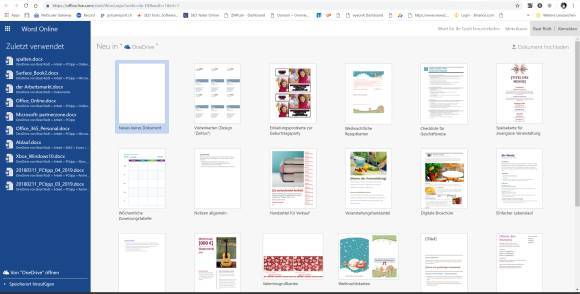Auf den ersten Blick sehen Sie bei Word & Co. praktisch keinen Unterschied zur Vollversion, die auf einem Computer installiert wird. Sie können ein Neues leeres Dokument öffnen, Bild 4, eine Vorlage auswählen und wenn Sie bereits Dokumente auf OneDrive gespeichert haben, diese per Klick weiterbearbeiten.